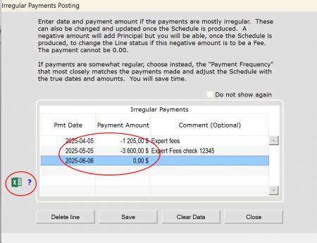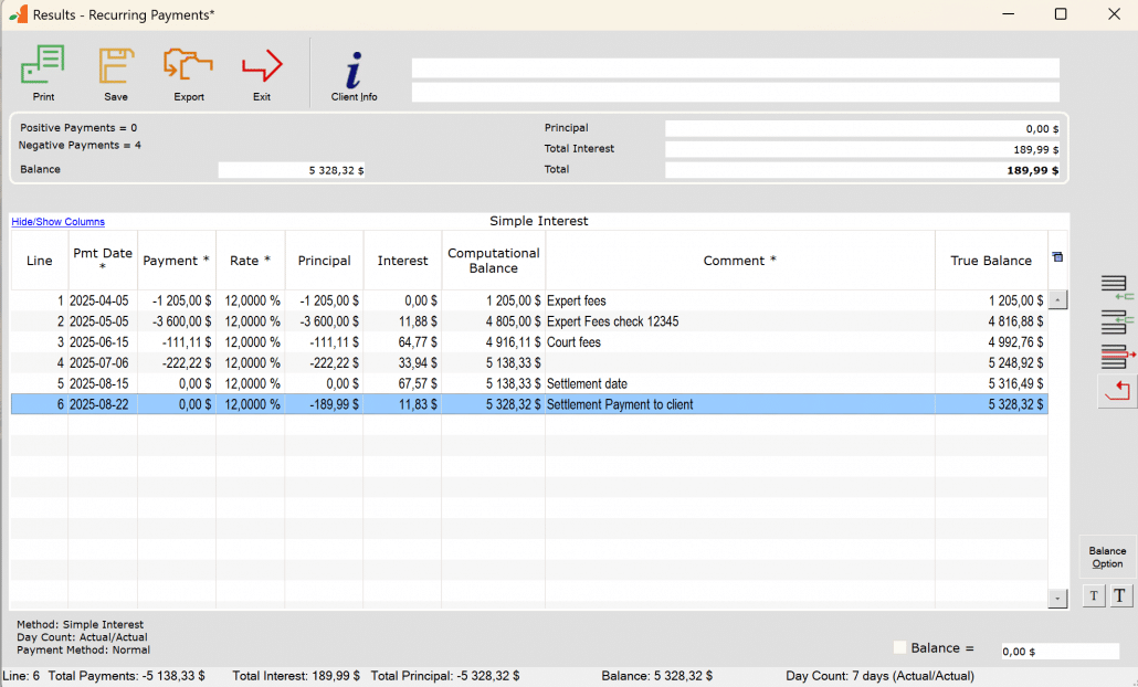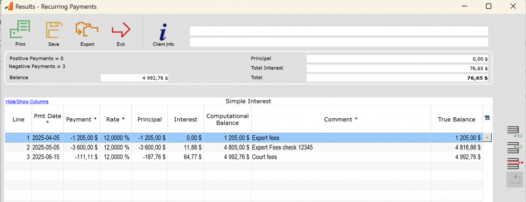 Fees should be added as negative amounts (positive amounts are payments you would have made to your client – rare in these situations since the payment is made upon settlement). Enter the date at which the interest starts on these (some law firms will only charge interest 30 days after the amount is paid to the supplier). A comment can be added.