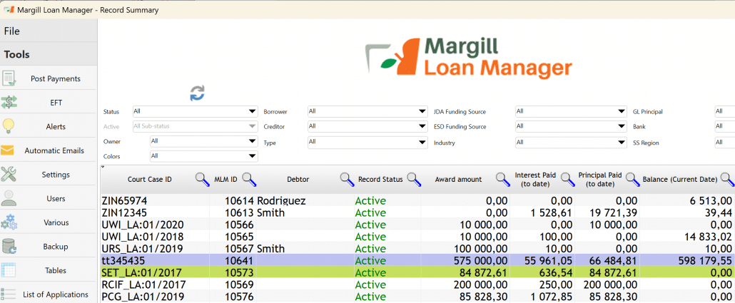 If you have a higher volume and wish to import hundreds of transactions on a regular basis, then the Margill Loan Manager is a powerful database that allows impressive options. Below is the Main window with all your cases and you can obtain the global “portfolio” balances at any date, create statements, send emails, mass import data, and so much more!