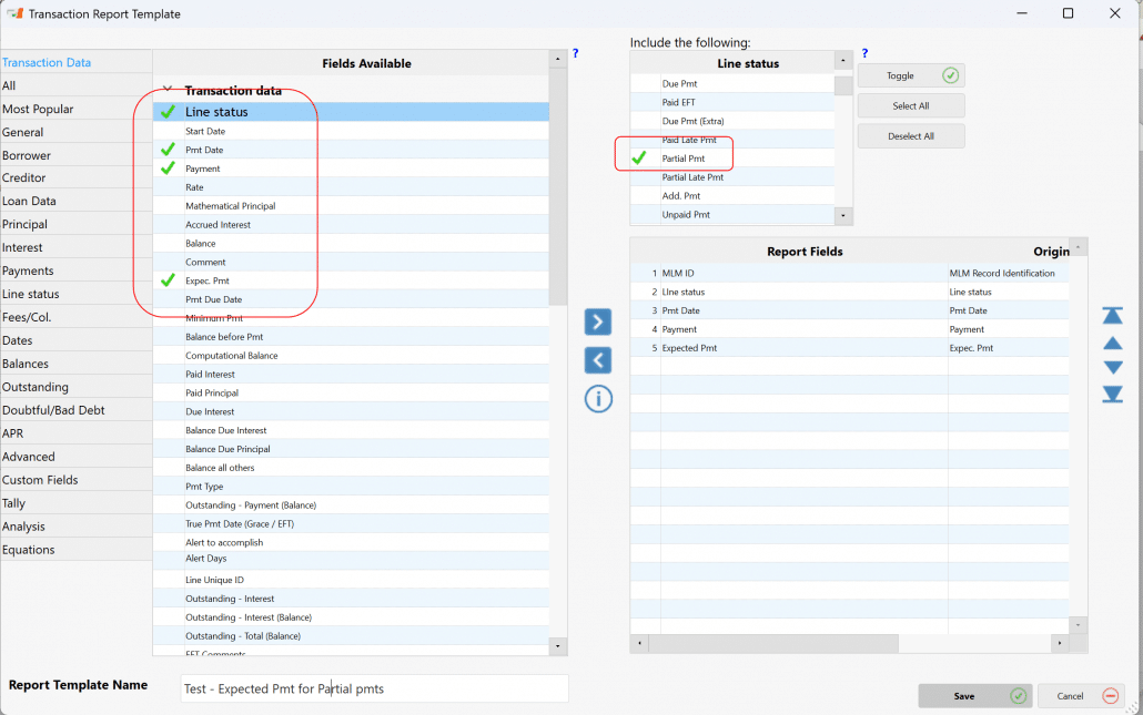 Save the template and run the report for all Records in the database or at least the Active loans.