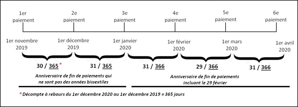 Une deuxième méthode, un peu plus complexe, prend en compte la date anniversaire de paiement pour calculer l’année de base. L’exemple dans le Tableau 2 démontre la méthode de calcul selon laquelle, en comptant à rebours, le nombre de jours est pris en compte entre la fin de la période de paiement réelle et l’année précédente. Pour les intérêts accumulés du 1er novembre 2019 au 1er décembre 2019, cette méthode tiendra compte de la date anniversaire (de décembre 2019 à décembre 2018, à rebours) pour calculer le nombre de jours de cette année-là. Puisqu’il y a 365 jours dans cette période, 365 sera utilisé comme base. Pour la période du 1er mars 2020 au 1er avril 2020, la base de 366 sera également utilisée car du 1er avril 2020 au 1er avril 2019 (en comptant à rebours), il y a 366 jours.
