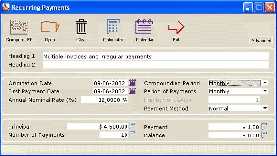 $4500 is the starting principal (first amount due). Although the invoices are irregular, we can create an approximate table which will be edited afterwards. That is why a payment of 1$ is included (we could have used “Irregular” payments).