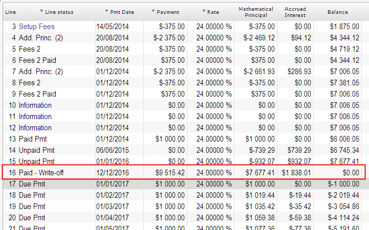 For reporting, you can isolate the payments called “Paid – Write-off” and as of version 4.2 you can even get the Principal, Interest and Column Fees that were “paid” (actually written off):