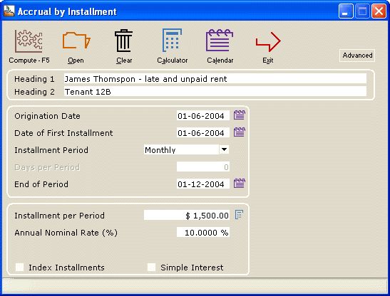The October rent was paid, thus we changed the original $1500 to $0.00. In all, 4 rents were unpaid ($6000) bearing a total interest on December 1 of $184.64)